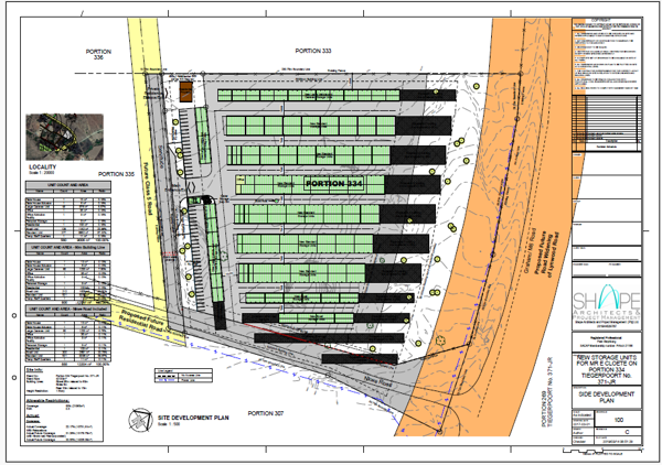 Includes 521 units of 18 sq m, 212 units of 9 sq m, 60 caravan storage units of 20 sq m, plus a gate house, office, 2 ablution facilities, residential and workers quarters, and personal storage.