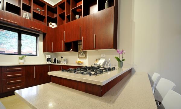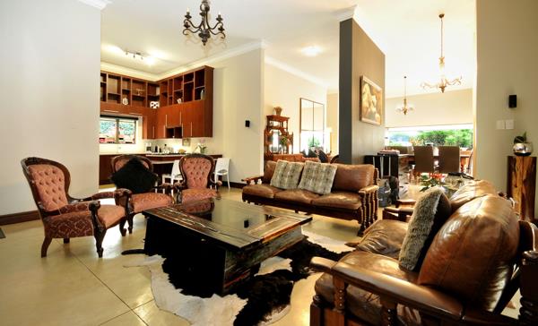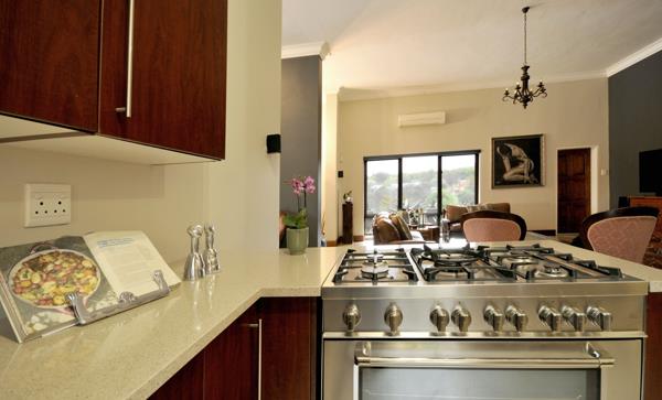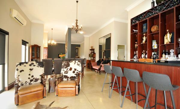 A stylish built-in wooden bar enhances the entertainment space, flowing naturally onto the patio and pool area. Warm evenings can be spent around the fireplace or boma- an absolute entertainment house.