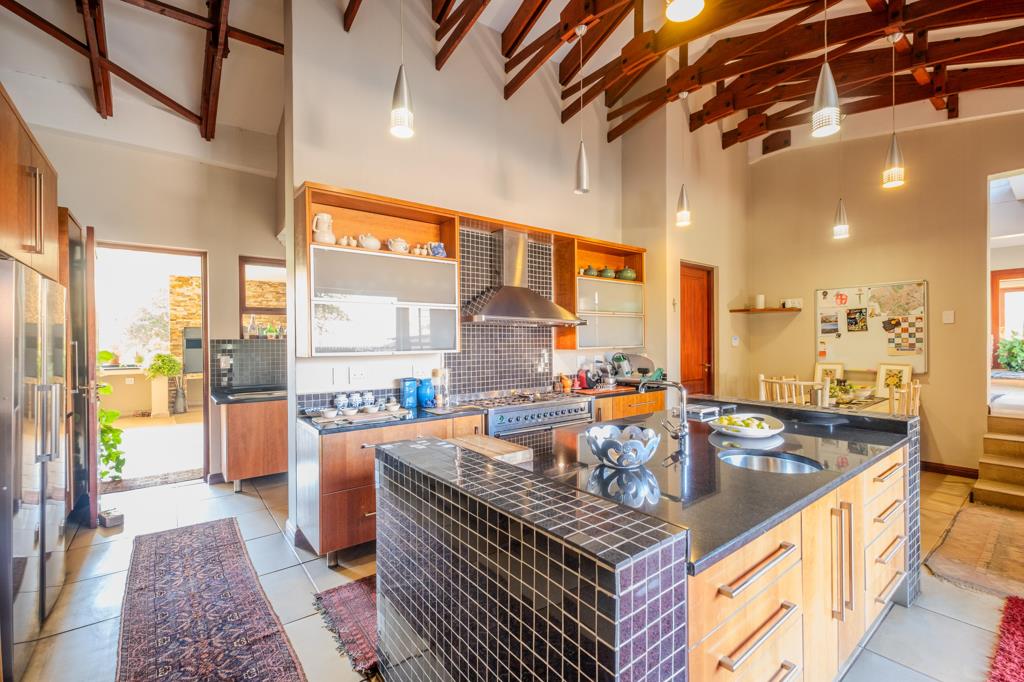 * Expansive covered patio with built-in braai, pizza ovens, and counter with basin, next to the pool.