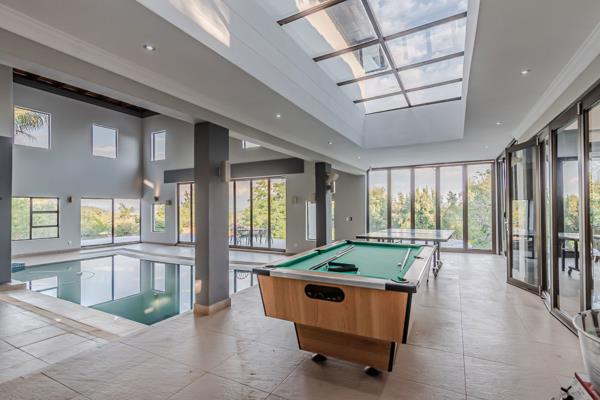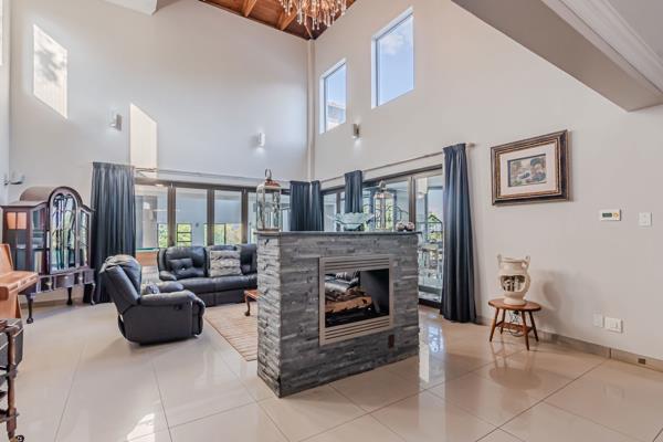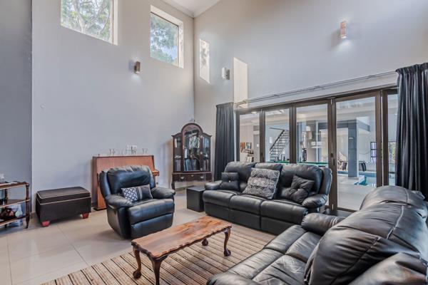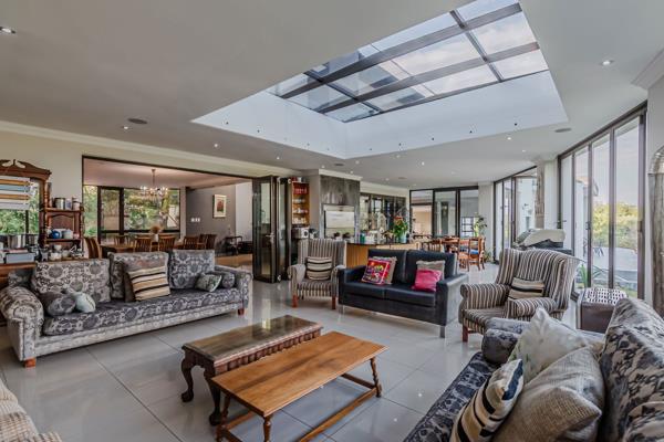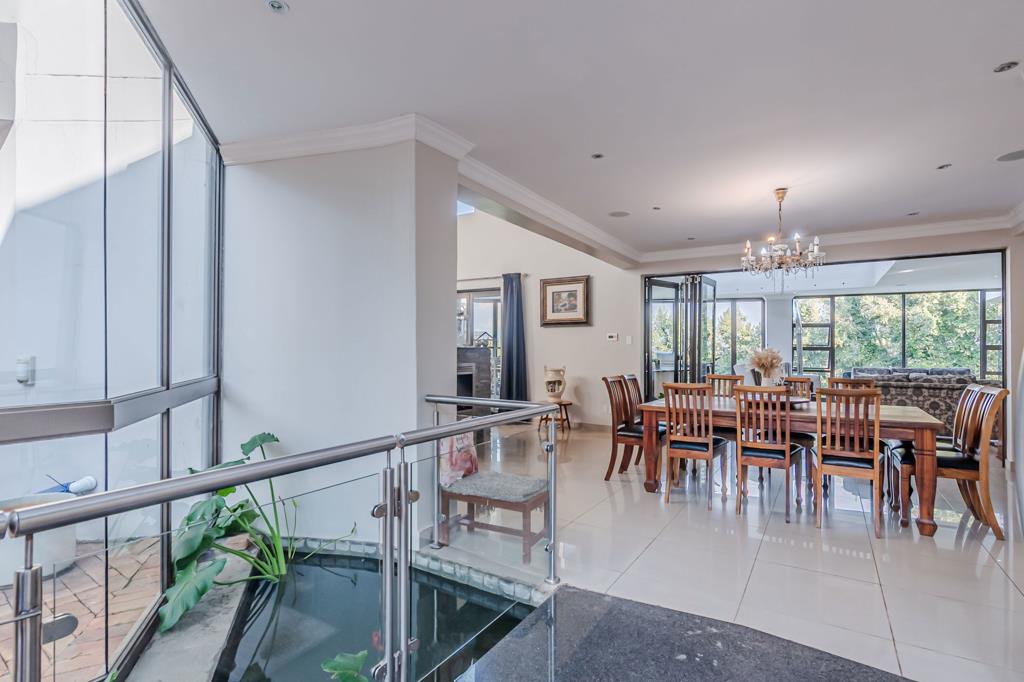 The modern design of this house provides all the advantages of open spaces and natural light. The house is built on two levels with, on the northern side, the vehicle driveway, main entrance and core of the structure at ground level. On the opposite side a gentle down slope provides the most amazing views, especially at sunrise and sunset. In entering the house over a koi pond, one is struck by the extra high ceilings, perspectives and voluminous light-filled living spaces. The entrance hall flows seamlessly into a formal sitting room with double-sided fireplace, a dining room and very spacious kitchen. A wall of glass stacking doors opens to an entertainment living room with built-in braai which in turn, opens through similar doors onto a large indoor swimming pool in a cavernous space. The kitchen has granite countertops, a large center island, gas stove and oven plus a separate induction hob, plenty storage and there is a walk-in pantry plus a scullery. Beyond the kitchen is a guest toilet and a very large multipurpose family room study including a special room for the computer management of the home.