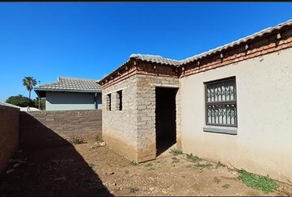 Externally, the property is situated on a 281 square metre erf, offering ample space for landscaping. Dedicated areas are provisioned for a covered patio and a multi-bay carport or garage structure, which, though unfinished, accommodates one garage and three parking spaces. The current state necessitates completion of plastering, painting, and the installation of windows and doors, allowing for comprehensive exterior design.