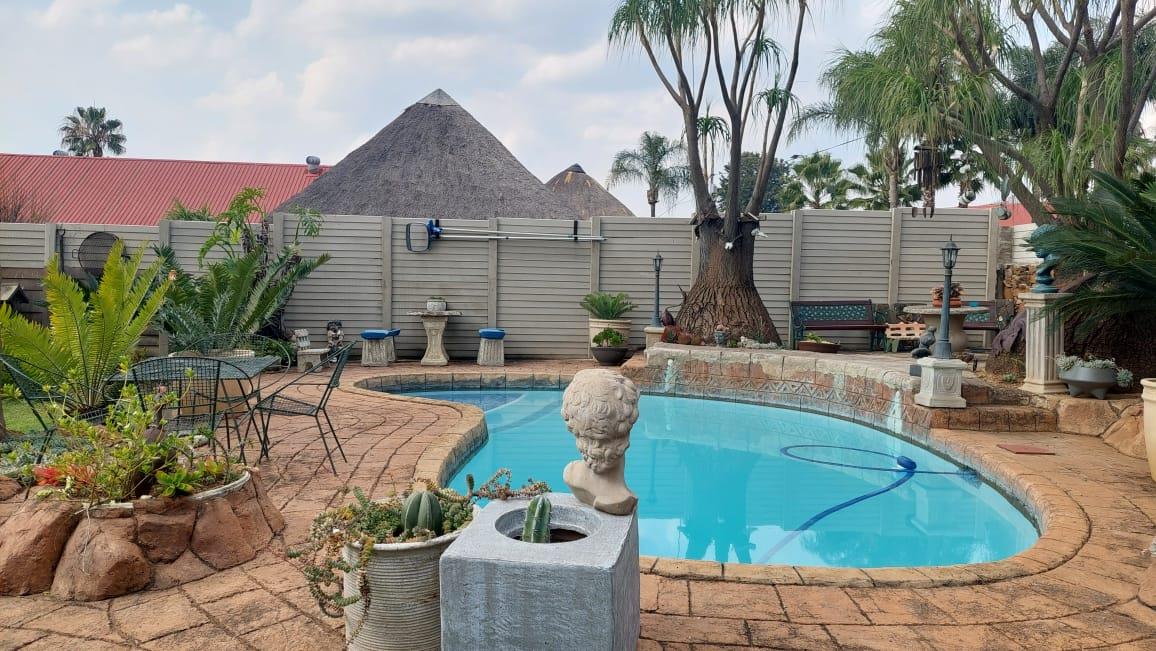 The property also features a beautiful garden, swimming pool, borehole, electric fencing, alarm system, and secure parking for up to 8 vehicles. Erf size: 993sqm.