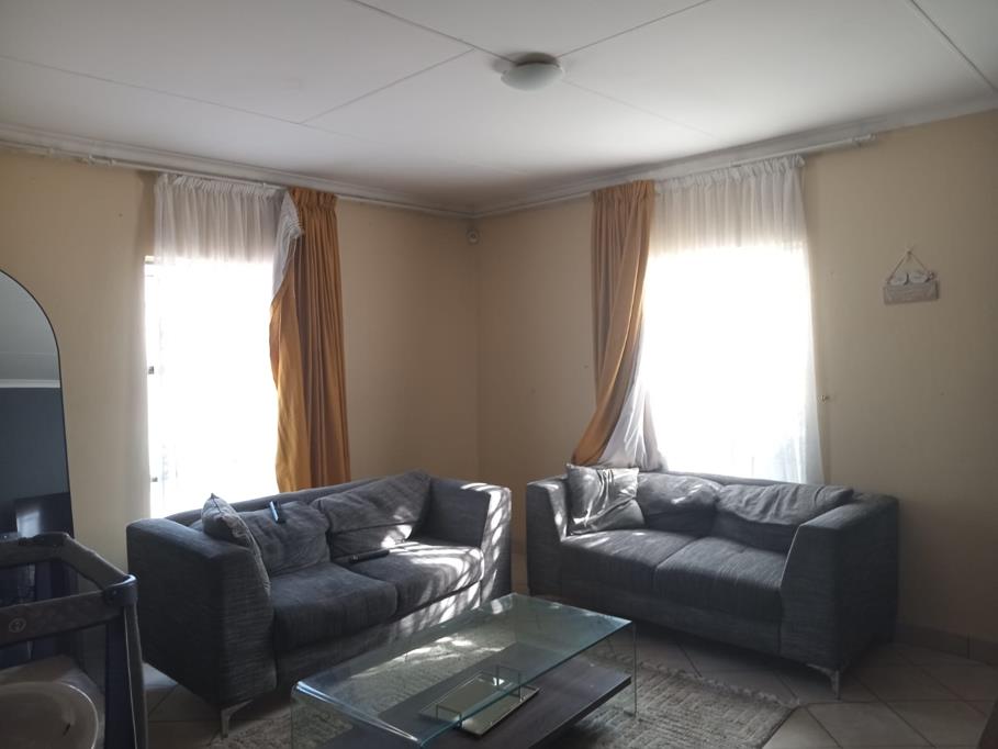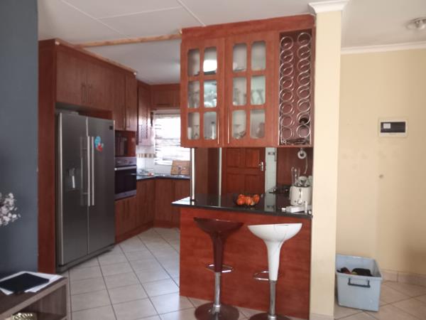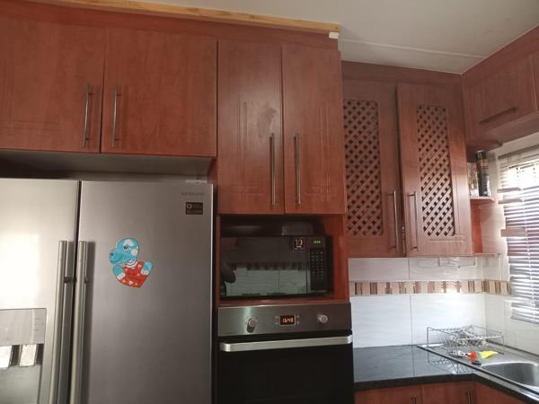 The property features three generously sized bedrooms, including a master bedroom with an en-suite bathroom. Two of the bedrooms are fitted with built-in cupboards, offering ample storage space. The kitchen is equipped with beautiful cupboards, a gas stove, and an electric oven. Additionally, there is a spacious lounge, perfect for accommodating a large family.