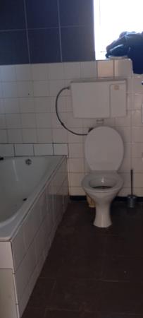 1 neat, tiled bathroom with toilet, Bath tap and Basin