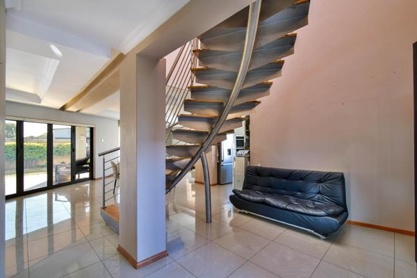From the moment you step inside, youre greeted by a striking spiral staircase and a spacious dining area that sets the tone for the elegance throughout the home. The heart of the home features an open-plan kitchen and lounge, designed for effortless flow and connection. The kitchen is modern and stylish, complete with a separate scullery for added convenience. This layout is perfect for entertaining and family living.