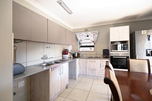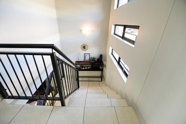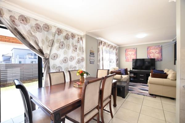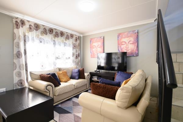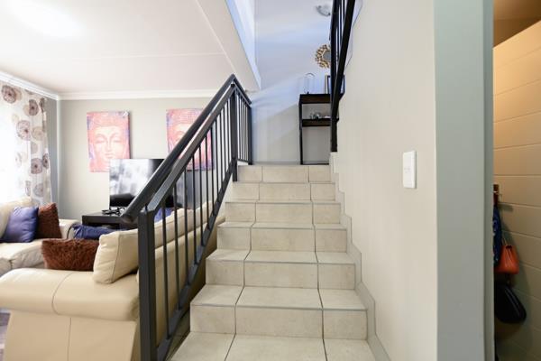 Downstairs, you''ll find a spacious open-plan lounge and dining area, seamlessly flowing into a modern kitchen with sleek finishes and ample cupboard space as well as a double sink. The home is tiled throughout for easy living and features built-in cupboards in all bedrooms for neat storage. The main bedroom boasts a private en-suite, while the additional two bedrooms share a stylish second bathroom.
