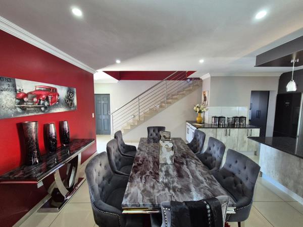 A pajama lounge upstairs adds to the comfort and versatility of the home. The modern open-plan kitchen includes a breakfast nook and a separate scullery, flowing effortlessly into the expansive dining and lounge areas. For convenience, theres also a handy storeroom under the stairs.