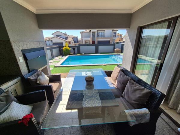 Step outside to a covered patio with a built-in braai, overlooking a sparkling swimming poolperfect for outdoor entertaining and relaxation.
