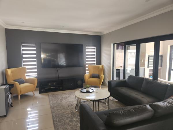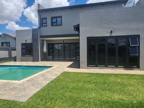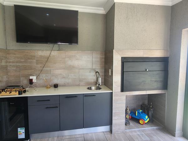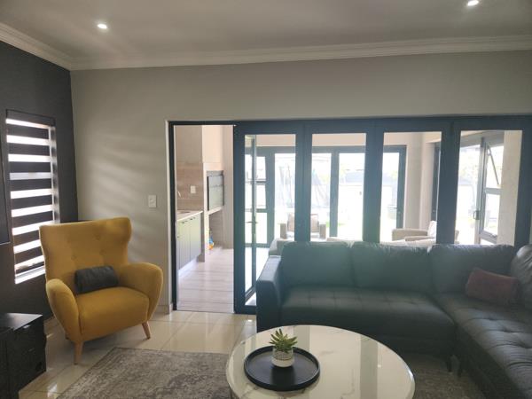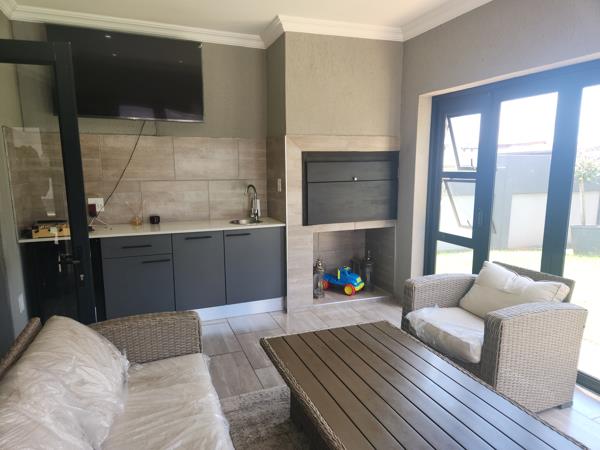 The lounge opens onto a covered patio with a built-in braai, making it perfect for year-round entertaining while overlooking the swimming pool and private garden.