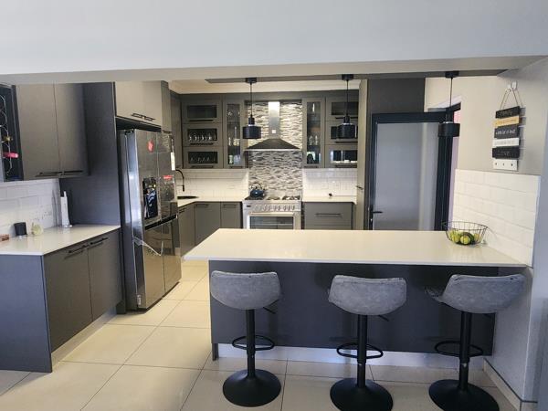 At the heart of the home is a modern open-plan kitchen, featuring an electric oven and hob, a gas hob, and a separate scullery and laundry for added functionality. The kitchen flows seamlessly into the spacious lounge and dining area, creating a warm and inviting central living space.
