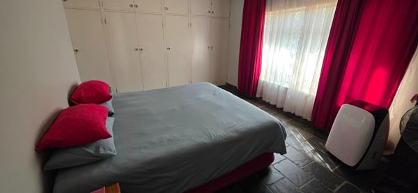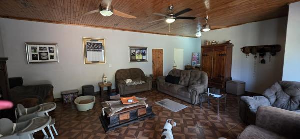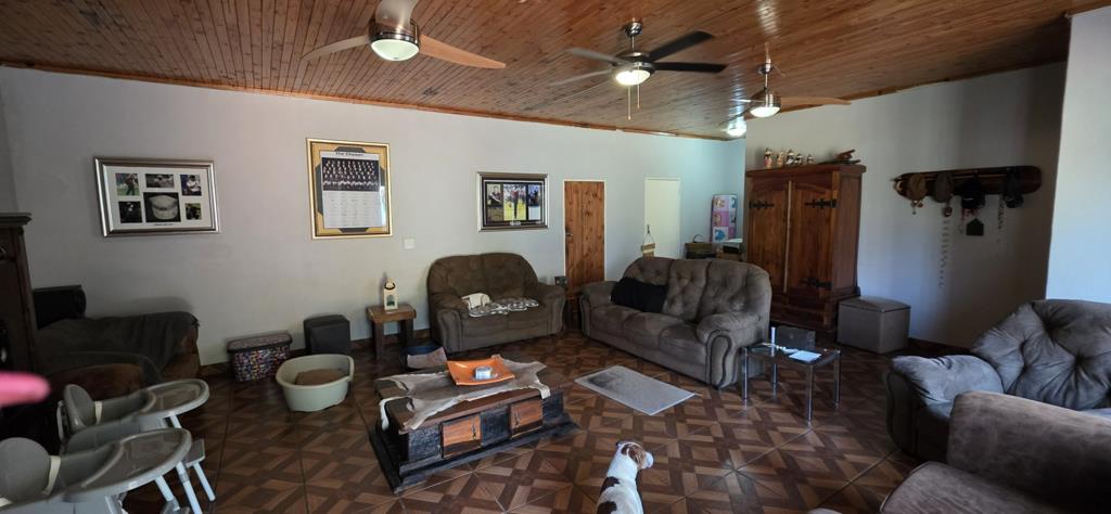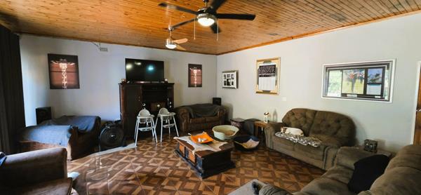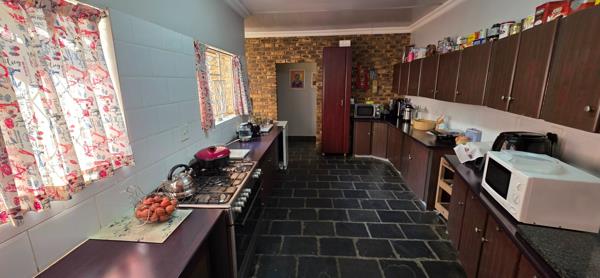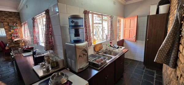 The spacious living room is adjacent to a small flatlet, with bathroom, and own entrance, although it can be accessed via the house - ideal for multi-generational living. A wooden hut is electrified and serves as staff accommodation. The 4 bedrooms all have built-in cupboards and the main is en-suite. Another full bathroom with separate toilet is available to the other rooms. The kitchen is literally the centre of the house and has a separate scullery. A study and formal separate lounge, and dining room completes this picture. The property is sold with a 5kva inverter with 3 Lithium batteries.