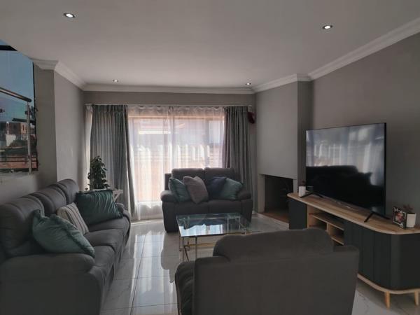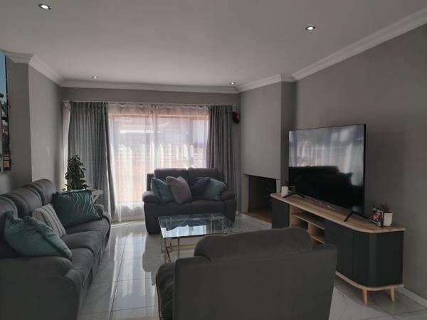 This modern home features four spacious bedrooms, each equipped with built-in cupboards and en-suite bathrooms. The property includes a contemporary kitchen with built-in cupboards and a scullery, flowing seamlessly into an open-plan lounge and dining area. A dedicated study and entertainment space add to the home''s appeal.