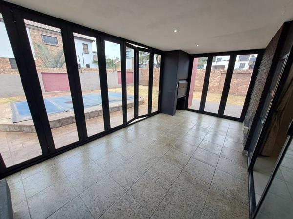 The heart of the home is the open-plan kitchen, complete with a gas stove and ample cupboard space, seamlessly flowing into the living and dining areas. Enjoy year-round outdoor entertaining with a closed-off patio, including a built-in braai, and a sparkling pool to cool off in during the summer months.