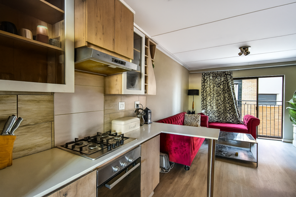Open-plan kitchen and lounge area, leading onto a small private balcony perfect for a morning coffee or quiet evening