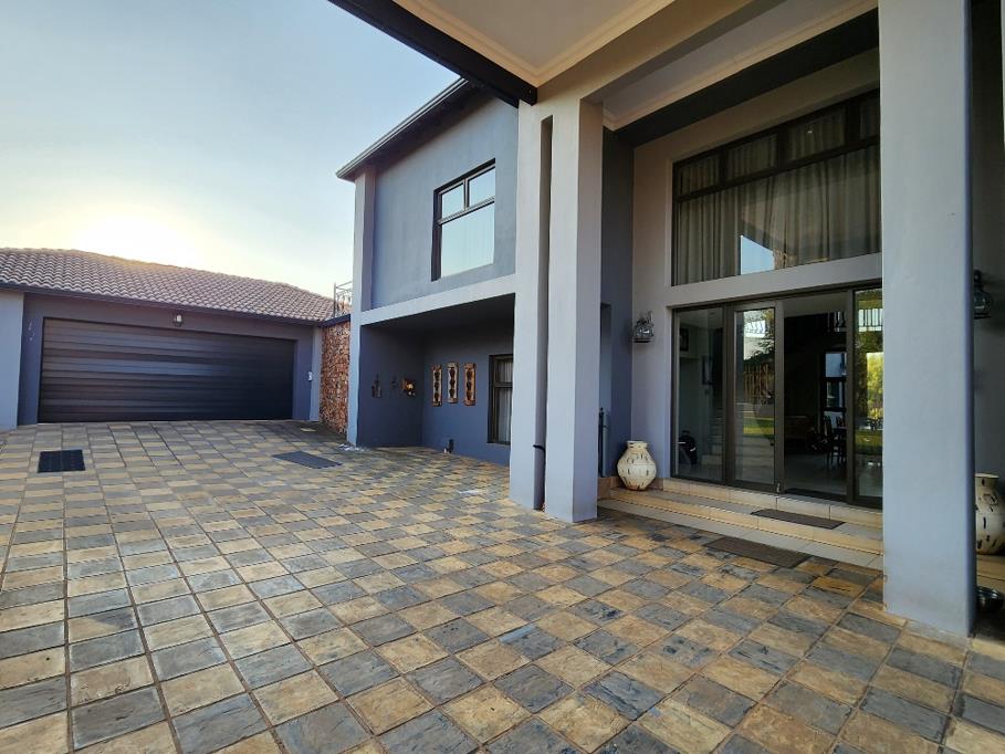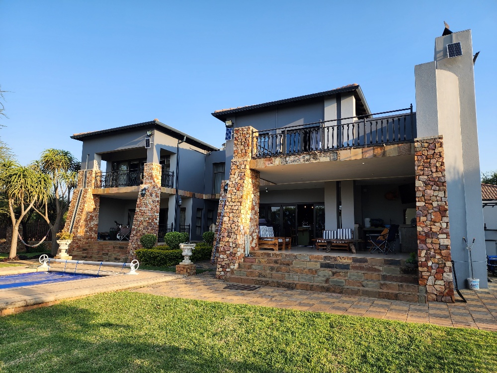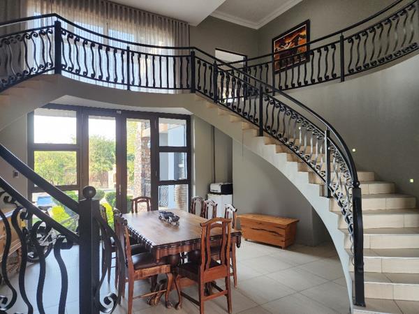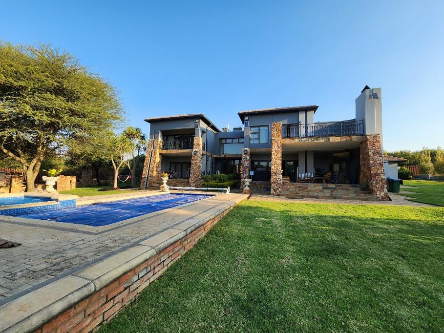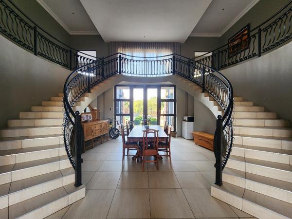 Grand design and top of the range finishes characterise this immaculate family home situated on a 1ha plot in a secure area with an access controlled gate - only 18 properties in this small estate. The impressive double staircase invites you in and a feeling of warmth fills your heart. The lovely french country kitchen has all the amenities you need, including a pantry and walk-in fridge. Aluminum doors open up onto the patio with a built-in braai and views of the garden. There are two lounges, that also open up onto the patio. The main entertainment area of this property is the impressive boma, that will make you the envy of all your friends. Next to the boma with pizza oven, is the sparkling pool and jacuzzi. This property will not be on the market for long.