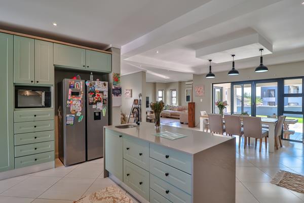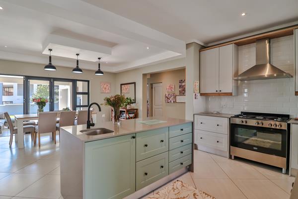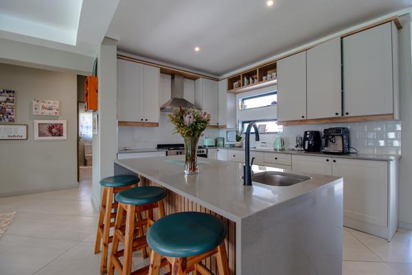 The home features four generously sized bedrooms, all with built-in cupboards. Three of the bedrooms share a full bathroom, while the spacious main bedroom boasts its own en-suite bathroom. The modern kitchen includes a scullery, an island countertop, and is equipped with a gas stove and electric oven.