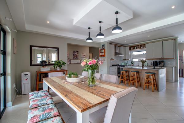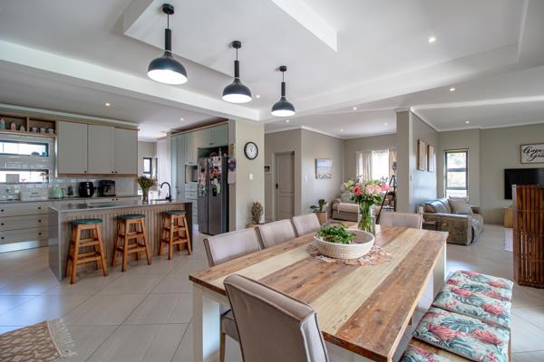 Stacking doors from both the lounge and dining room lead to a covered outdoor entertainment area, complete with a built-in braai, perfect for gatherings. The large garden and sparkling swimming pool further enhance the appeal of this well-priced property.