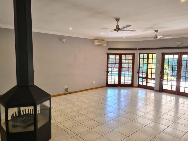 Open-plan lounge and dining room with a cozy fireplace and seamless flow to a large covered patio with built-in braaiperfect for entertaining.