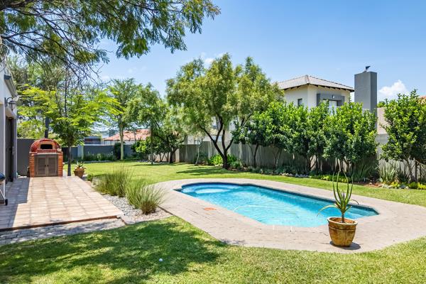 Enclosed by walls, this property boasts a spacious garden, an extra garden area, and a sparkling swimming pool. A private nook adorned with indigenous trees and a covered patio provides an ideal spot for relaxation, complemented by an outdoor pizza oven for entertaining guests.
