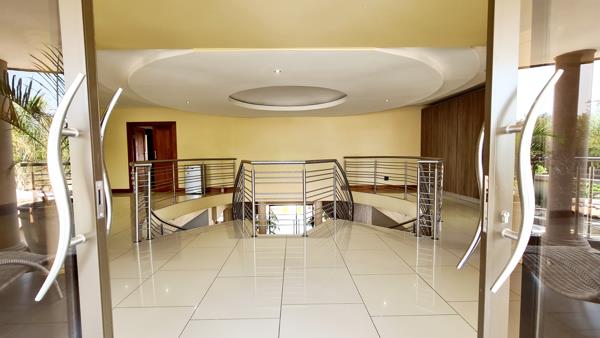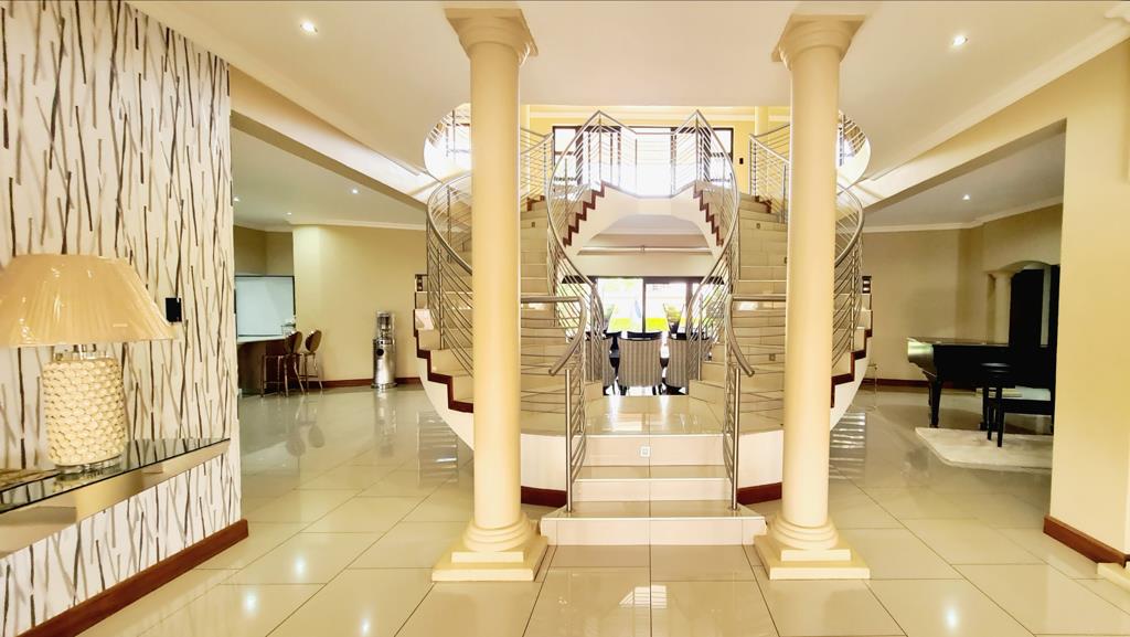 The outdoor space is perfect for entertaining, with an entertainment patio featuring automated curtains, a built-in braai, and a boma area. The swimming pool adds a touch of luxury to the property.