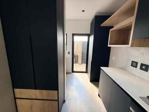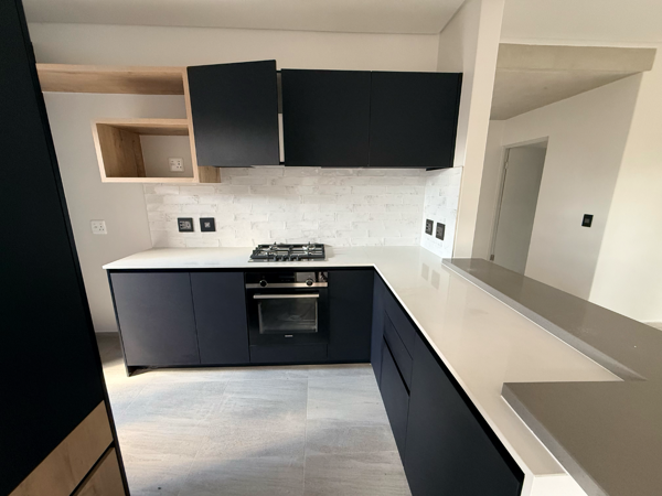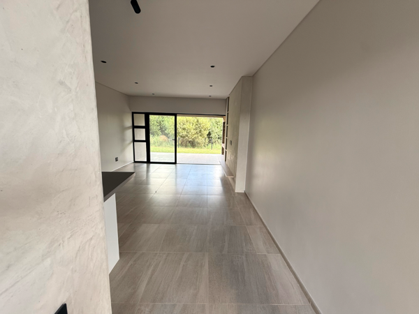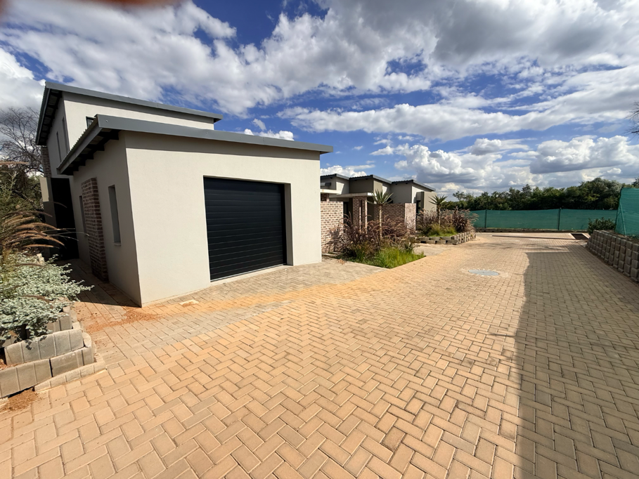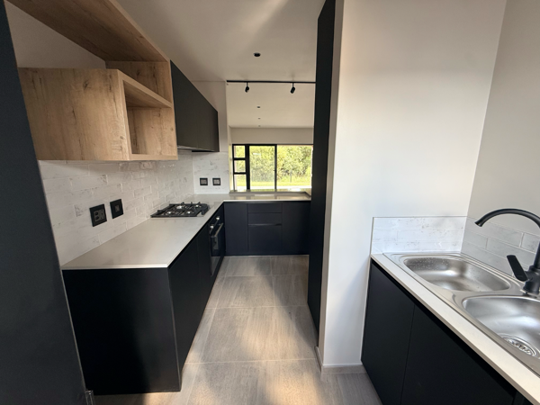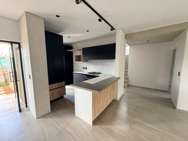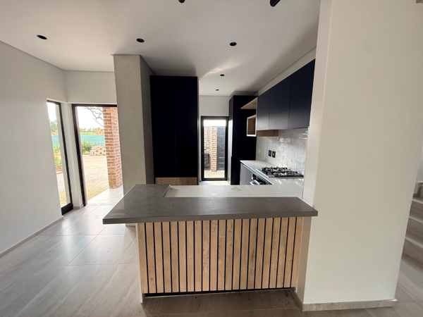 Discover an unparalleled lifestyle within the prestigious Sable Hills Waterfront Estate, Roodeplaat Dam, Pretoria, where modern luxury meets serene natural beauty. This exquisite 171 m2 residence, designed for sophisticated living, presents a seamless open plan layout bathed in abundant natural light. The contemporary kitchen is a culinary masterpiece, featuring sleek dark cabinetry, pristine light countertops, a stylish subway tile backsplash and a gas hob, all complemented by a chic breakfast bar with wooden accents. Integrated wooden shelving and an entertainment unit define the elegant living spaces, offering a canvas for personalized refinement.