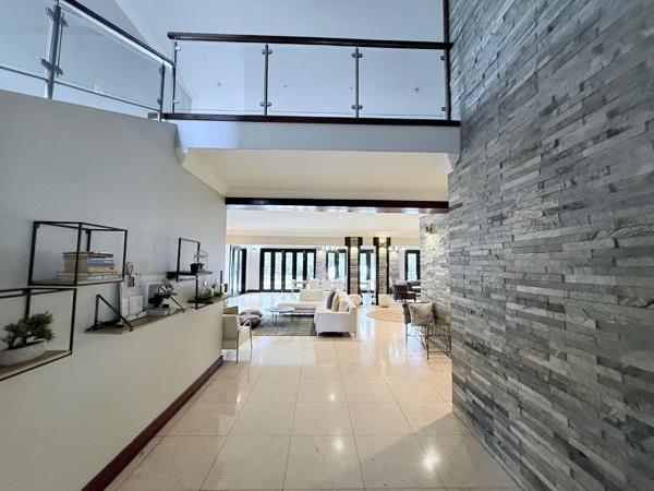 Step inside to an expansive 1100m2 of meticulously designed space, where a double height entrance hall with striking stacked stone accent walls and elegant glass railings sets a tone of sophisticated grandeur. The open plan layout downstairs seamlessly connects two lounges, a distinct dining area all bathed in natural light and adorned with polished tile flooring and high ceilings with a magnificent fireplace, perfect for both intimate gatherings and lavish entertaining.