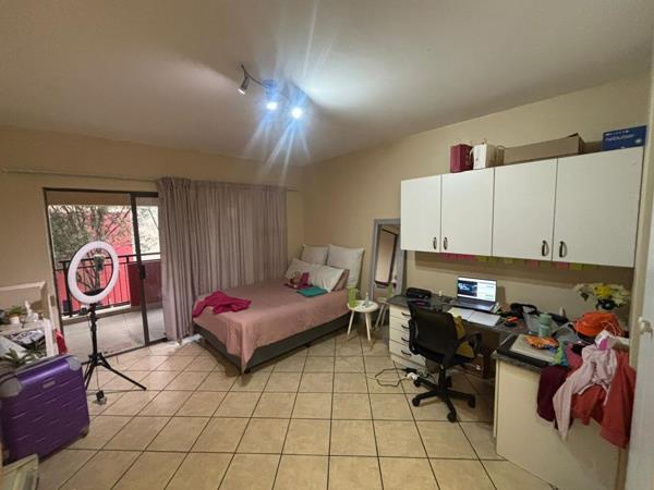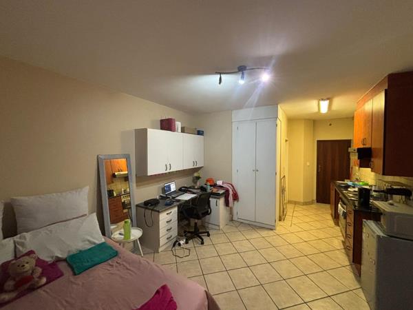 Unit is a top floor unit with open plan spacious tiled area (study corner with cupboards) and kitchenette.