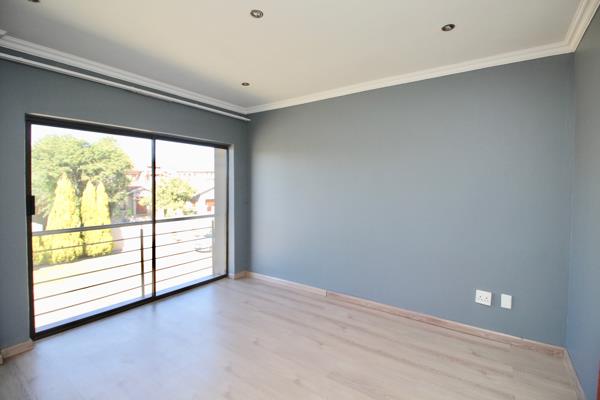 Fourth bedroom, north facing with laminate floors, sliding doors opening to a small balcony, built-in cupboard and en-suite bathroom.