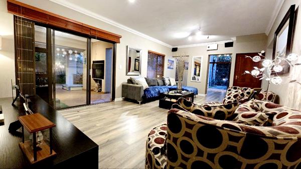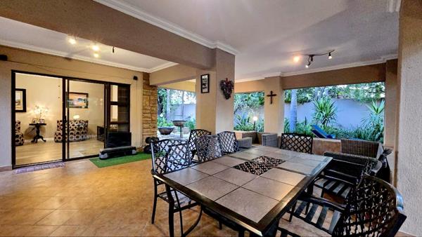 Outdoors, enjoy year-round entertaining on the covered patio, gather around the boma, or unwind beside the palm-lined black marblelite pool. A generator connection, JoJo tank, and double garage add daily convenience, while top-tier security ensures peace of mind.
