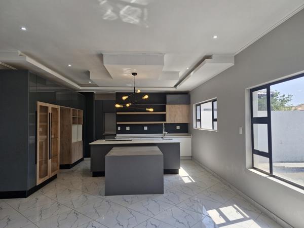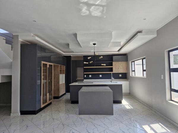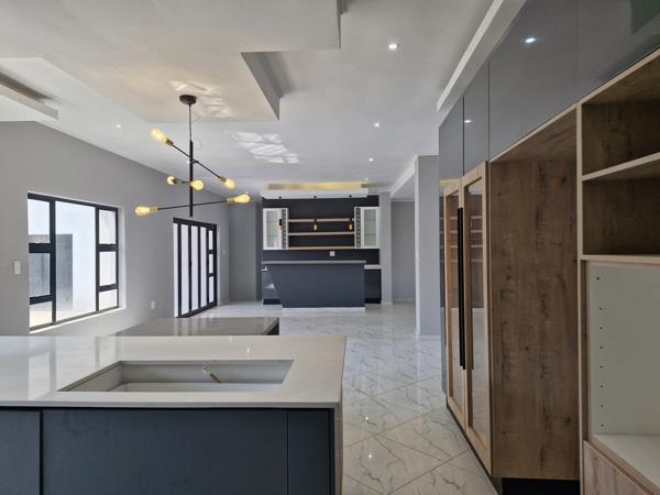 A modern kitchen with glossy storm gray elements complemented by touches of Brookhill Melamine create a stylish and balanced aesthetic. A modern kitchen also offers a state-of-the-art finishes typically features sleek and minimalist design elements, Quartz countertops offers a sleek and modern appearance, provide a durable and easy-to-maintain work area for cooking and food preparation. Open shelving and minimalistic cabinetry, space for double door fridge, dishwasher and washing machine.