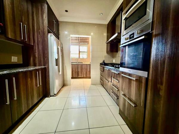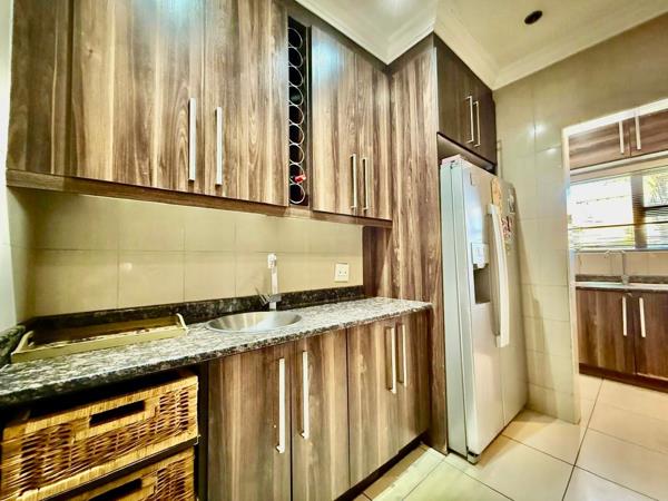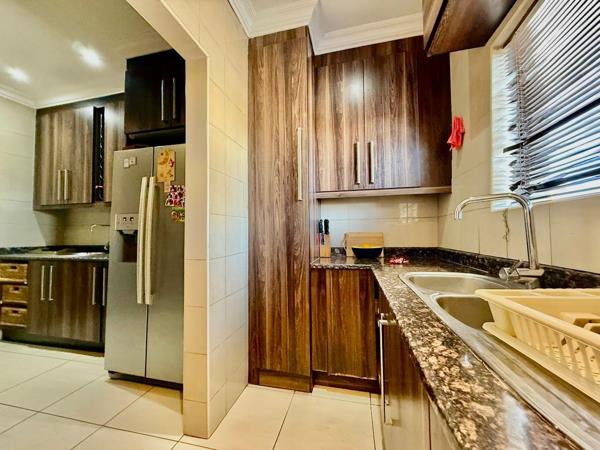 To one side of this airy open space, the modern kitchen awaits, featuring stunning granite countertops and a separate scullery area that adds to its functionality. From the dining room, a corridor leads to two substantial bedrooms, each equipped with built-in cupboards and sharing a beautifully designed bathroom. At the end of this hallway, the expansive main bedroom awaits, showcasing an abundance of storage with its ample cupboards and spacious walk-in closet, which leads to a luxurious ensuite bathroom. The main bedroom also boasts sliding doors that open onto a private patio, offering a serene retreat that flows into the backyard.