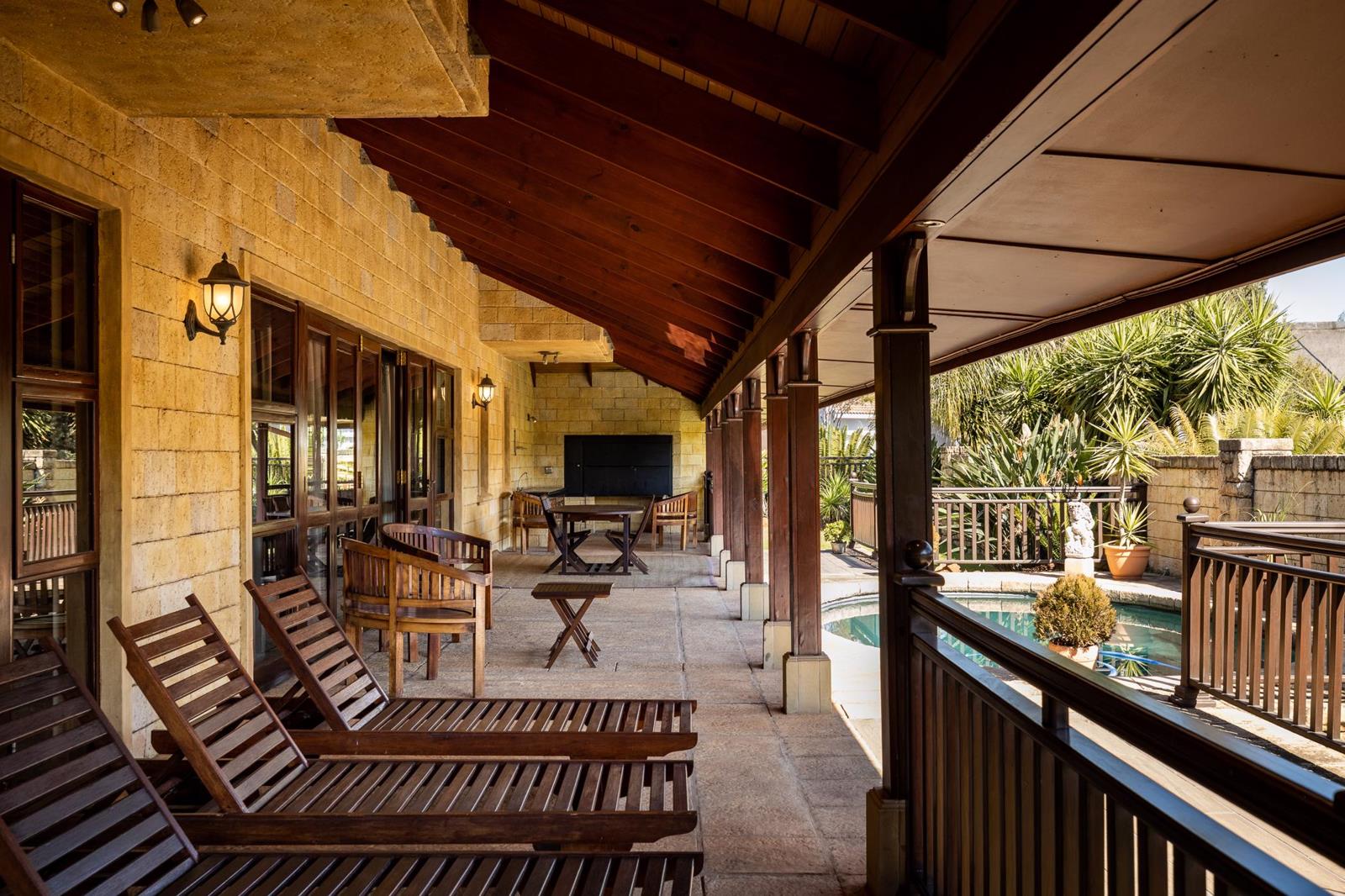 An awe-inspiring home. If you are used to the best of the best then you must see this property! A Vincenzo Sagnelli design, complete with a Charles Gothard water feature, Balau wood and imported granite. Impeccable home offers 3 spacious en-suite bedrooms, with a study and open living areas with a build in bar and wood fireplace. Immaculate finishes. Beautiful wrap around stoep with heated pool. Low maintenance and LED lightning through out. Staff quarters can also be used as a separate 4th bedroom with own entrance.