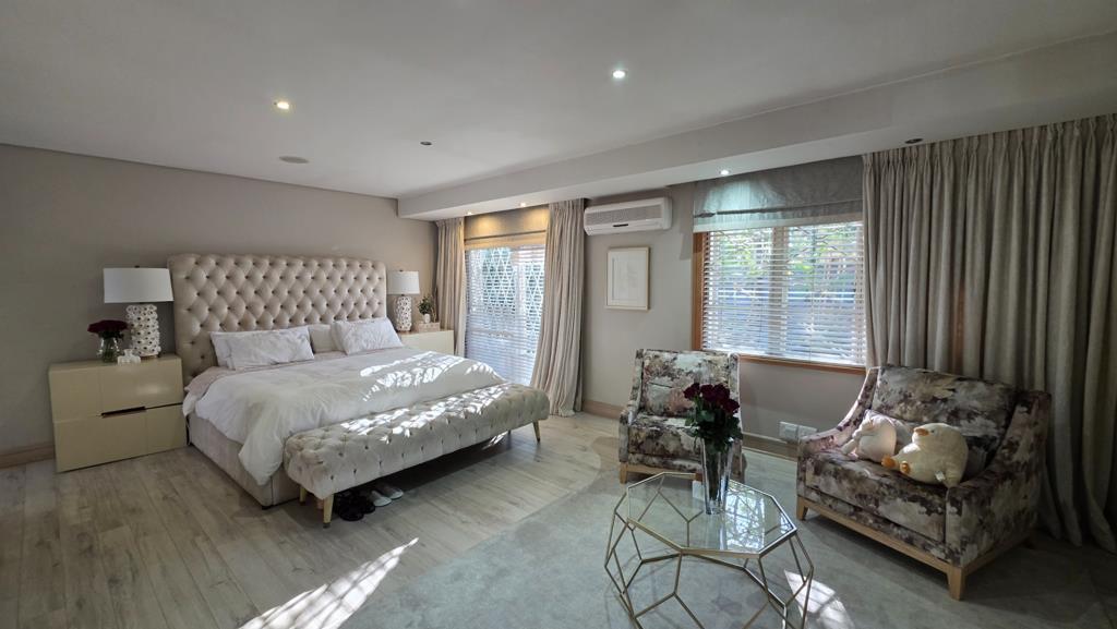 This home offers five luxurious bedrooms. The opulent main en-suite retreat features its own private lounge space, a generous walk-in closet, and a lavish full bathroom with a large shower and a modern glass cubicle toilet. An additional upstairs bedroom also boasts its own full en-suite bathroom and the added luxury of a private wrap-around balcony for stunning views. The remaining two bedrooms share a third full bathroom, providing comfortable accommodation.