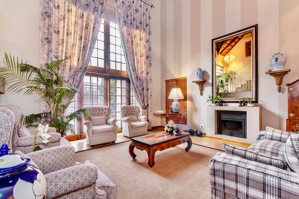 The double-volume living and dining area is bright and spacious, opening through large double doors to a private garden and covered patio with built-in braai. The modern kitchen includes feature cabinetry, a breakfast nook, double ovens, and a separate scullery with walk-in pantry.