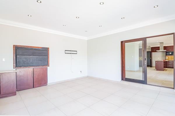 A welcoming double-volume entrance leads into expansive open-plan living areas, filled with natural light and warmth. The lounge, complete with a cozy fireplace connects to the dining room and entertainment spaces. A fully equipped braai room with built-in braai flows to the outdoors to the sparkling pool and landscaped garden.