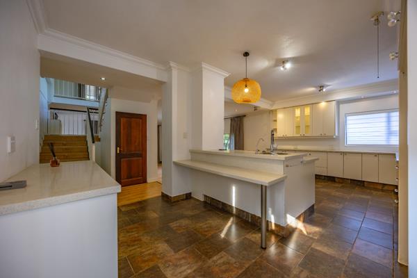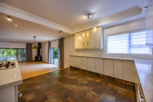 Step through the beautifully landscaped front garden into a grand double-volume entrance hall, illuminated by natural light and elegant chandeliers. The open-plan living area is the heart of the home, featuring a spacious lounge with a fireplace and custom cabinetry, a dining area opening onto the garden and pool, and a sophisticated kitchen complete with a central island, gas stove, double oven, walk-in pantry, and separate scullery/laundry.