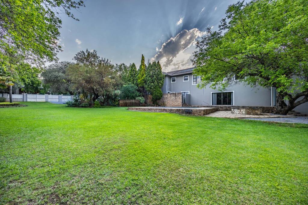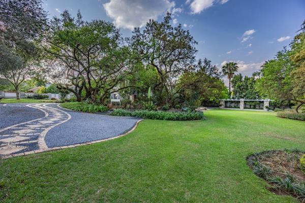 Outdoors, the property offers a private oasis with a swimming pool, pergola, boma, and a sprawling lawn surrounded by mature trees. Additional features include staff accommodation, two tandem garages accommodating up to four vehicles, and ample guest parking.