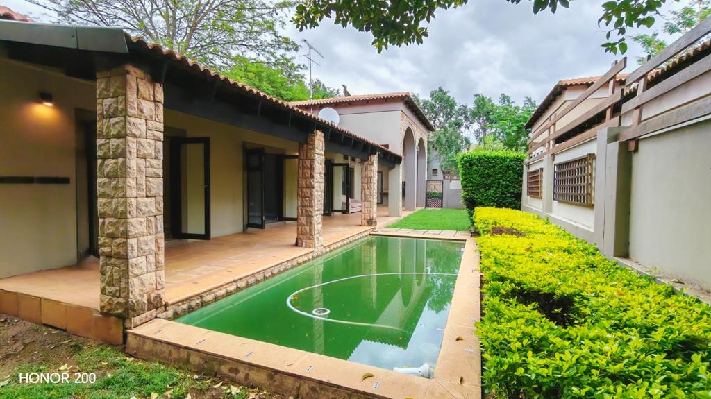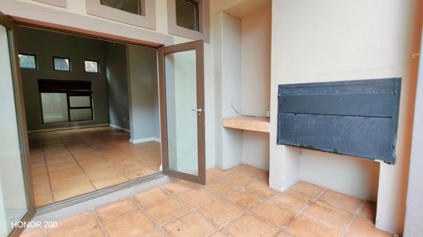 The covered patio includes a built-in braai, making it ideal for entertaining and relaxing beside the pool.