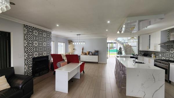 Outdoor living is a delight with a private patio, complete with a built-in braai, overlooking a sparkling pool perfect for relaxation and entertaining. The property also includes staff quarters, an air conditioning system, a sprinkler system, and water tanks for efficiency. Situated on an 858 sqm erf, this home offers a blend of luxury and functionality.