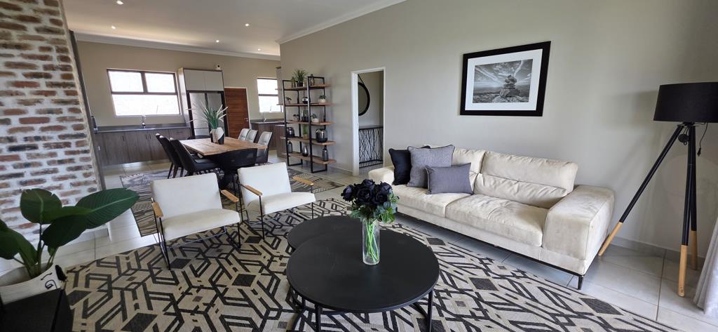 As you enter, youre welcomed by a spacious covered patio with a built-in braai, perfect for outdoor dining, entertaining, or simply relaxing in your private garden. The modern open-plan kitchen is the heart of the home, fitted with a gas hob, electric oven and a separate scullery with space for all appliances. The dining and lounge areas flow seamlessly to the patio and garden, creating an inviting and functional living space.