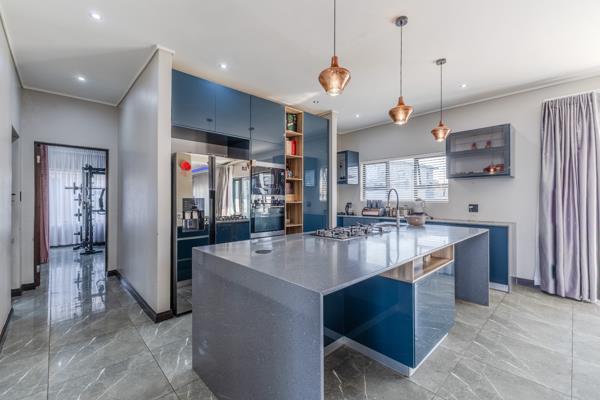 Welcome to this modern 4-bedroom masterpiece located in the prestigious 6 Fountains Estate. The ground floor is designed for effortless living and entertaining, featuring open-plan living spaces with sleek contemporary finishes. The stylish kitchen flows seamlessly into the dining and lounge areas, while large glass doors open onto an entertainers dream backyard. Outside, youll find a sparkling swimming pool, built-in braai, sunken boma area, and a tranquil koi pond the perfect setting for family gatherings or weekend relaxation. With three garages, generous storage, and ample parking out front, this home combines practicality with striking curb appeal.