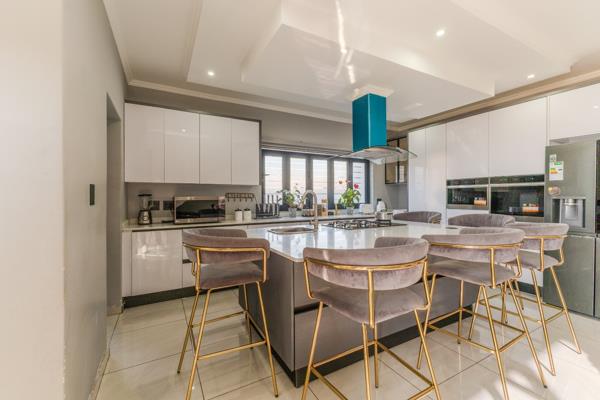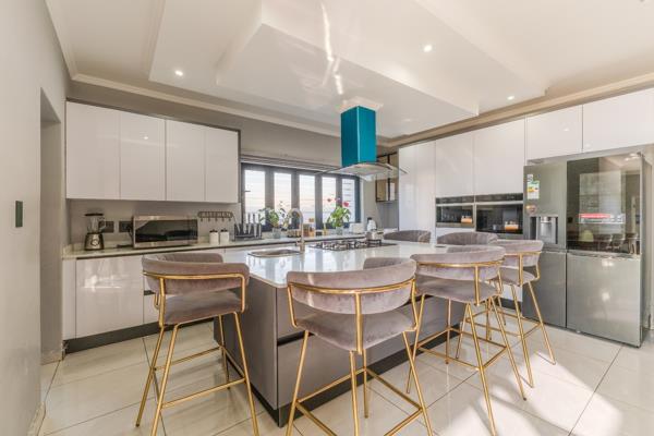 Nestled within the prestigious Six Fountains Estate, this contemporary four-bedroom residence showcases a seamless blend of modern elegance, luxurious finishes, and family-focused functionality. As you enter the home, youre welcomed by expansive open-plan living and dining areas that flow effortlessly into the outdoor entertainment space through large stacking doors. The heart of the home is the gourmet kitchen, fitted with top-of-the-line Whirlpool appliances, a central island with a prep basin and breakfast counter, and a separate scullery that provides direct access to the domestic quarterscomplete with a private en-suite. Ideal for hosting guests, the ground floor also features a private en-suite bedroom, a guest cloakroom, and a covered patio with a built-in braai that overlooks a professionally landscaped garden, sparkling swimming pool, and firepit-style bomaperfect for relaxed outdoor living and entertaining.