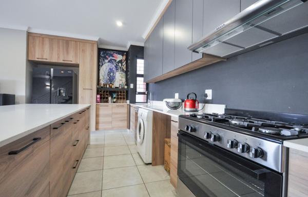 Stylish open-plan kitchen with premium finishes, ceaser stone tops, a gas hob, electric stove, ample cupboard space, and room for three appliances plus a double-door fridge/freezer.