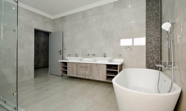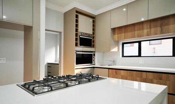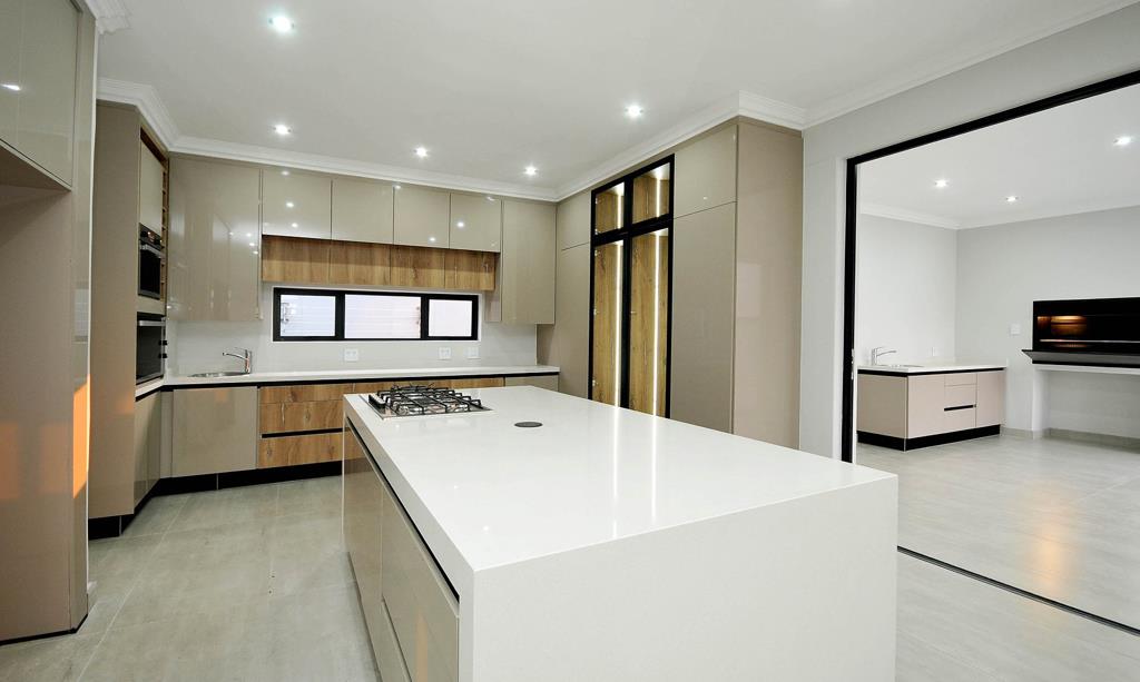 Modern, newly built four-bedroom home with high quality finishes throughout. The lower level offers a double volume entrance hall, a gourmet kitchen with gas stove & free-standing island & separate scullery / laundry area, an open plan dining room, an open plan family lounge, a study with separate entrance, a guest toilet, and a covered spacious patio with built-in braai. The fourth bedroom is also situated on the lower level and is served by the fourth en-suite bathroom. The patio leads out to the garden and pool area with wooden deck. The upper level offers a large pajama lounge, another three bedrooms, three luxurious en-suite bathrooms, and three balconies. The master bedroom and pajama lounge open up to a long balcony overlooking the garden and the other two bedrooms upstairs each open up to their own private balconies. The master bedroom is exceptionally spacious, has a separate dressing room, and is served by a full en-suite bathroom. Three automated garages, one double and one single. Domestic accommodation with bathroom. Elba stove + oven + extractor fan. Wide 1.2m staircase. Large private garden.