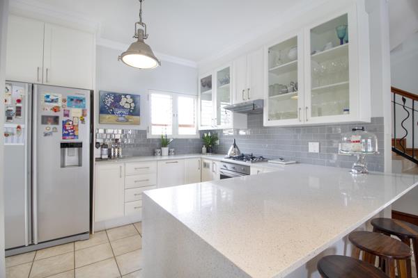 The open-plan kitchen, dining area, and lounge create a seamless flow ideal for entertaining, offering a warm and inviting atmosphere for shared meals and unforgettable moments. The sleek kitchen boasts high-end finishes, a gas stove, and a separate scullery with ample space for appliances and storage. The downstairs area is also complemented by a guest bathroom for added convenience, while the double automated garage provides direct access to the house.