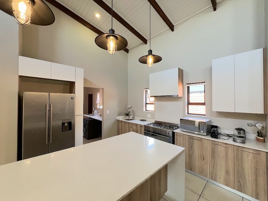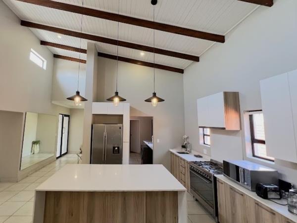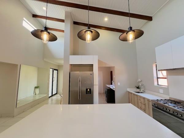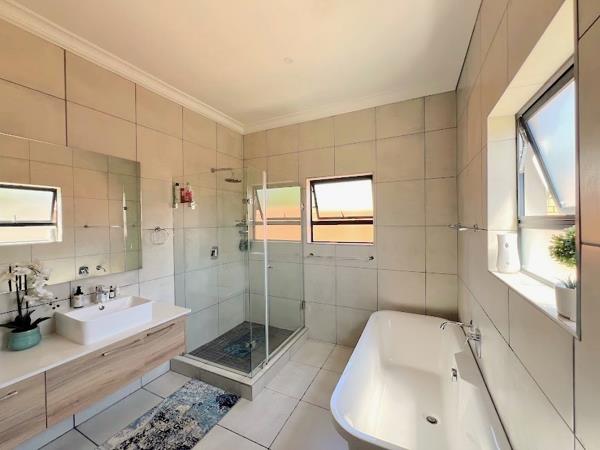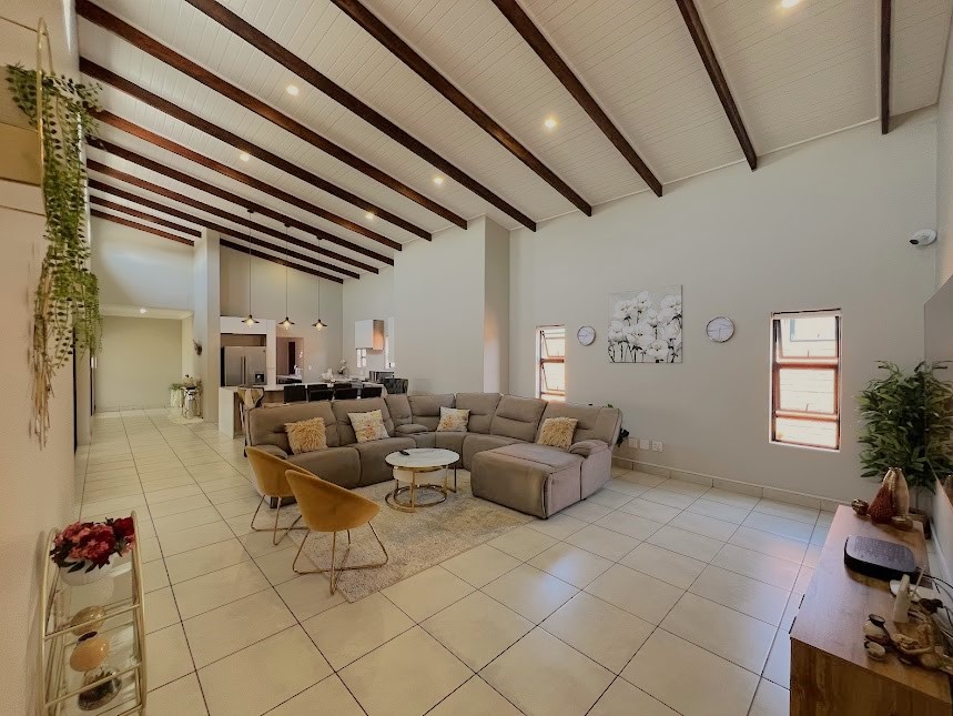 Perfectly kept single level home on spacious corner stand. The home offers a welcoming reception area, an ultra-modern open plan kitchen with breakfast nook & separate scullery / laundry area, an open plan dining room, an open plan family lounge, an enclosed patio with built-in braai, a study area with a 4-door built-in cupboard, four bedrooms and three bathrooms. The fourth bedroom is served by a bathroom with shower. The second and third bedrooms are served by a full family bathroom. The master bedroom has a separate dressing room and is served by a full en-suite bathroom. The living areas are separated from the braai room with stacking doors that could be opened completely to form part of the entertainment area. The covered patio opens up completely with stacking doors and lead out to the garden area. Separate toilet outside. Double automated garage. Solar Geyser.