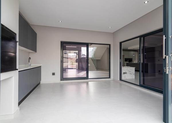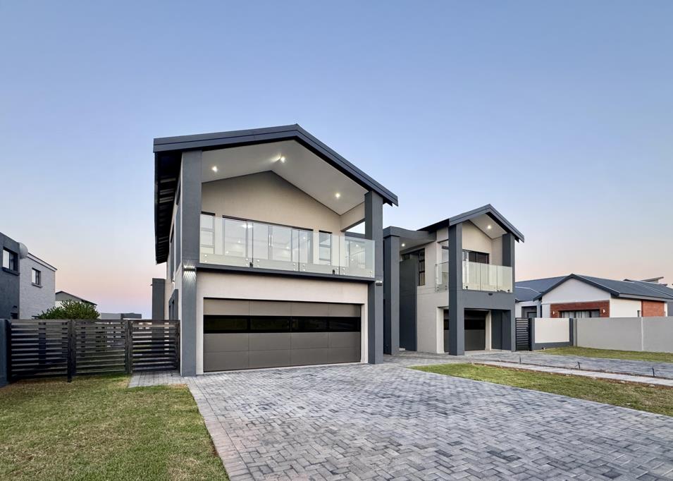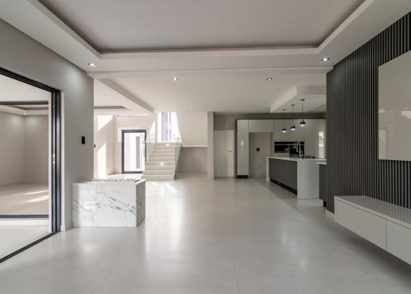 On the ground floor, a well-appointed guest bedroom with an en-suite bathroom offers privacy and comfort for visitors. A guest toilet adds further convenience, while full staff accommodation ensures additional practicality. A backup power system is in place to keep the home running smoothly during loadshedding.