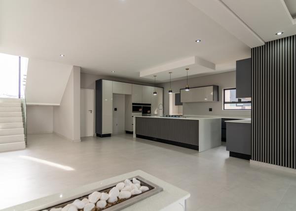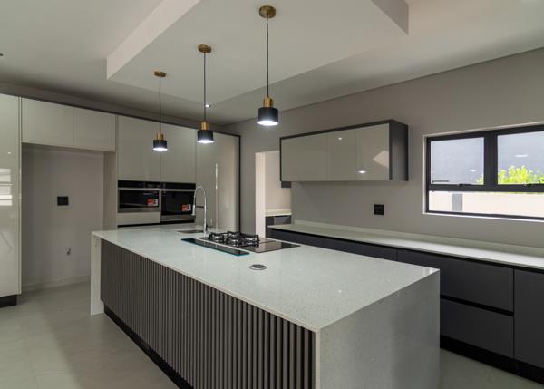 Inside, the home is both stylish and practical. The kitchen serves as the centerpiece, featuring both gas and electric cooking options along with sleek, modern cabinetry. A separate scullery with space for three appliances ensures a clutter-free environment.