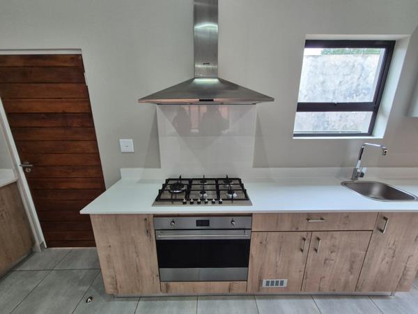 The open-plan kitchen is designed for both style and functionality, complete with a gas hob, pantry, and scullery. The dining and living areas flow seamlessly into an indoor braai area, with folding doors opening to a private gardenperfect for entertaining.