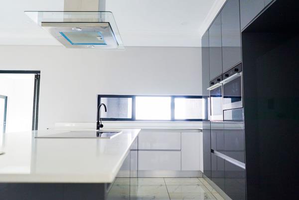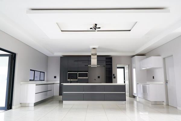 Open Plan Kitchen: A culinary haven, this kitchen boasts the finest of modern finishestwo eye-level ovens, ample space for a double-door refrigerator, a capacious pantry, and pristine white Caesarstone countertops. A separate scullery, rich in cupboard space, provides further convenience.